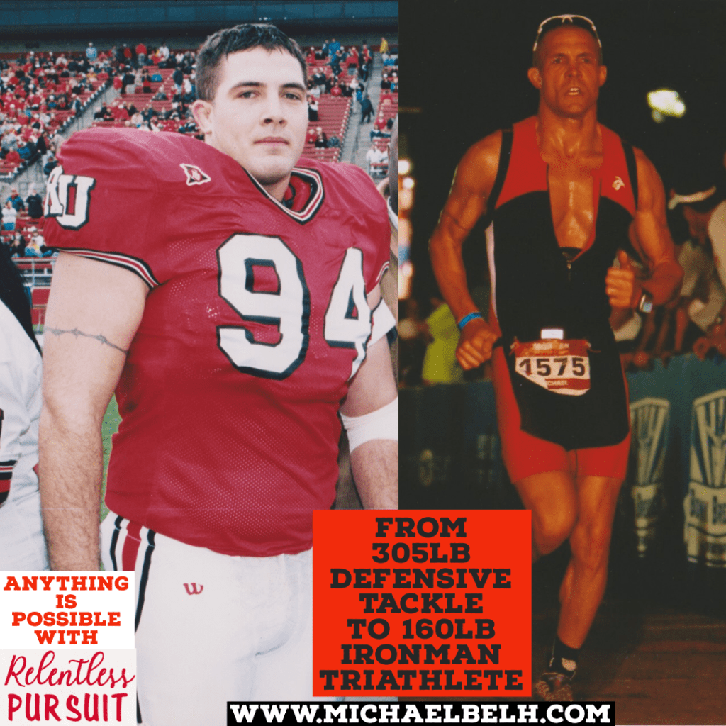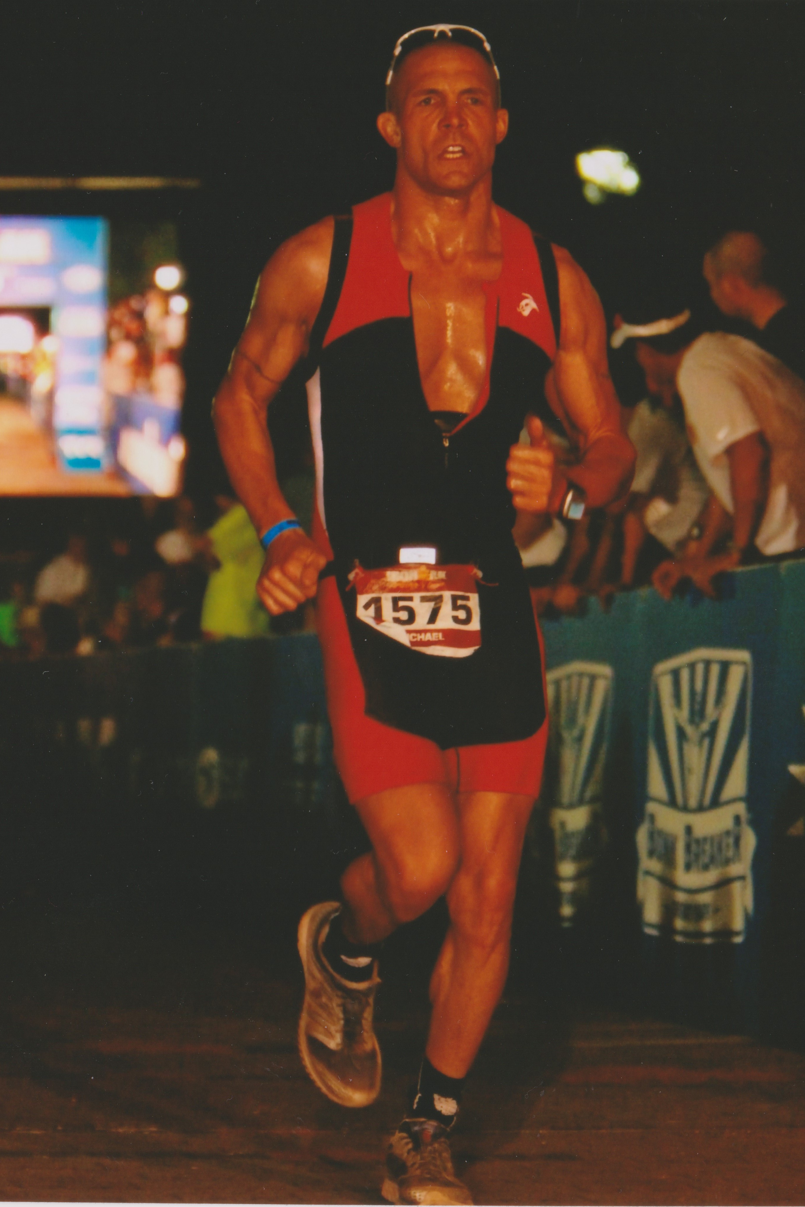 Today, Michael has transformed himself from a 305-lb football player and competitive eater to a 175-lb triathlete and marathon runner. He competes in Ironman triathlons, half Ironman, short distance triathlons and running races of all distance. The Ironman is a 2.4 mile swim, 112 mile bike and 26.2 mile run. He has qualified for the Ironman World Championships and the Ironman 70.3 World Championships twice and raced October of 2022 in the championship in St. George, Utah.